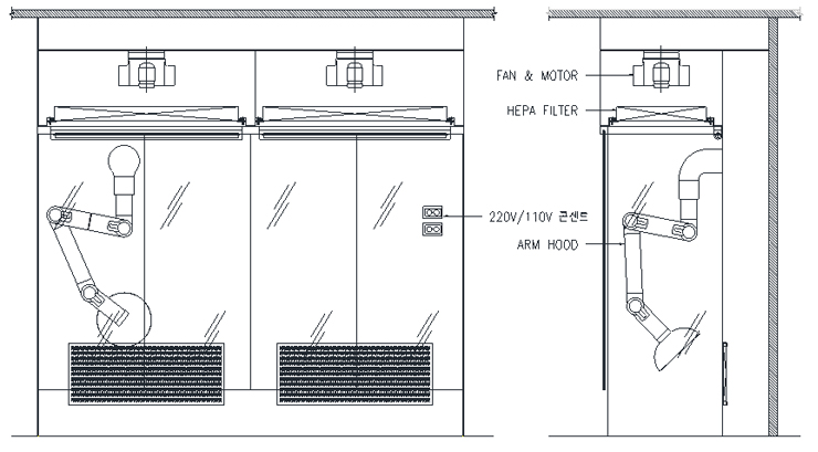 제약공정의 칭량실에서 사용하는 장비로 면풍속 기준 0.45 m/s (±20%) 기준으로 제작한다.
